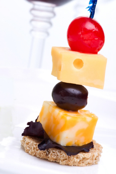 Everything from cheese plates to canapes can have more zing with flavored cheese. Here, Jalapeno Co-Jack from Loleta Cheese Factory and Emmenthaler are combined with red-leaf lettuce, a pitted olive and a grape tomato on a toasted bread round (first toast, then use a cookie cutter). Photo by Eugene Bochkarev | IST.