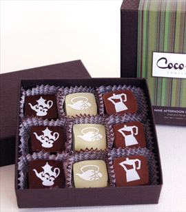 Stephanie Marcon took her initial inspiration for her chocolates from something a bit different: cake flavors! When was the last time you CocoaLuxesaw a Gingerbread chocolate or an Angel Food chocolate? I’m not the world’s biggest fan of white chocolate, but Coco-luxe has a special way with it: That Angel Food piece is wonderful! It’s a white chocolate ganache infused with vanilla bean, covered in white chocolate—not too sweet or cloying. If you prefer dark chocolate, you’ll find plenty of it here. Try the Double Cherry, a dark chocolate-cherry ganache with bits of dried tart cherries, or the Devil’s Food (straight dark chocolate). Milk chocolate fans are paid their due with the German Chocolate and Malted Milk pieces. One of the cleverest aspects of these chocolates is the built-in flavor guide: Each chocolate has a design atop that tells you what the center is. The Angel Food, for example, has a representation of a small angel on each piece, while the Double Cherry has a little edible outline of two cherries. Brilliant! Coco-luxeConfections.com