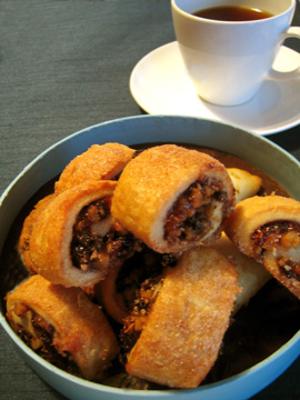 For the past few years, we have been noticing how really average so many rugelach are—and like making a bad Toll House® cookie, there’s really no excuse for it. You take basic ingredients—flour, butter, sugar, cream cheese, and eggs, make a dough, and roll with a filling of filling of choice—apricot or raspberry preserves and chocolate bits, nuts and raisins seasoned with cinnamon are the most common. Slice, bake and eat. Sounds simple enough, no?