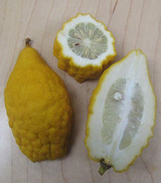 Citron is different from most citrus in that it lacks the pulpy juiciness of more common citrus: It is very dry with just a bit of juice. Instead, it is used for its rind. The thick white pith is the most important part of the citron, used as an ingredient and candied as a gourmet treat. The oil found in the peel is used in fragrances. From ancient times, citron was used mainly for medical purposes, some of which included gastrointestinal upset, pulmonary disease and even seasickness; the oil from the peel was used as an antibiotic. Citron juice taken with honey was considered an effective antidote to poison (but don’t count on it!).