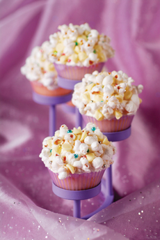 Caramel corn and kettle corn make cupcake cake decorating easy. Look for colored dragées to add even more visual excitement—or mix with mini-marshmallows. Photo by Zac Williams from The Pink Princess Cupcake Book.