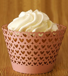 • Fancy cupcake wrappers—options include affordable paper wrappers like the one immediately below, to pricey die-cut beauties which cost more than $1.00 apiece (see photo below right).