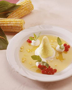 The photo at the left shows the ice cream served in melon soup with corn kernels, glazed red currants and crème chantilly; but our recipe uses a compote of strawberries, which are easier to find than red currants.