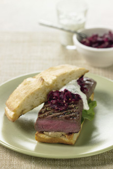 This recipe uses lamb eyes of loin. Top with the beet relish and yogurt and enjoy with iced tea or a glass of Pinot Noir. If you don’t like beets, you can substitute a savory chutney. Prep and cook time is 35 minutes.