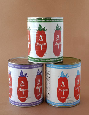 San Marzano tomatoes are sold crushed, diced and whole. In the Simpson (unbranded) product, the tomatoes are canned with salt, calcium chloride to keep the color bright and citric acid as a preservative. The liquid in each can is an exquisite tomato juice—don’t discard it, but enjoy it as a snack while you’re cooking. The cans are 28 ounces (1 pound, 12 ounces).