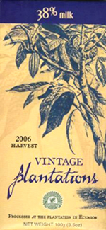 38% Milk Chocolate. Ironically, this is perhaps Plantations’ most successful bar, as Arriba is among the most suitable cacaos to withstand the dilution of milk solids. Despite the rough texture, this could very well be one of the best milk chocolate bars on the market.