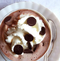 Glass rimmers for cups or glasses of hot chocolate add an extra touch of flavor and a festive look to the rim. Cocktail rimmers for chocolate martinis, espresso martinis, peppermintinis and orange blossoms are essentially the same product and work perfectly for this. Stirrings and Wildly Delicious both have a mocha-chocolate rimmer for coffee and cocoa (it also can be used around the rims of iced lattes and chocolate milk). Or, make your own. Mix ingredients like instant chocolate drink and cinnamon; or unsweetened cocoa powder, sugar and instant coffee. You can add sparkly decorative sugars too. Put your mixture in a soup bowl, moisten the glass or cup rim with a wedge of orange, and dip the moistened rim in the mixture to get an even coating about 1/8 to 3/8 inches deep. Then, pour the hot chocolate in carefully so as not to destroy your handiwork.