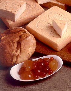 Taleggio, from the Lombardy region, boasts a flavor that cheese maestro Steven Jenkins describes as “beefy,” and I’d have to agree. It’s also got a nutty, buttery quality to it. Taleggio is a member of the Italian stracchino family of cheeses—meaning that meaning it was made with the milk of stracchio or “tired” cattle that were milked while on their way to (or back from) their seasonal pastures. It has a rosy-golden, inedible rind. The paste is gooey, soft and creamy, yet incredibly pungent and flavorful. It is often made in a square. Taleggio is a good melting cheese—Italians melt it on top of polenta or portabello mushrooms. It’s a good snacking cheese with ham, salami, fruit and bread. It’s a good cheese board cheese, too. (See the unwrapped photo of taleggio at the top of the page.)