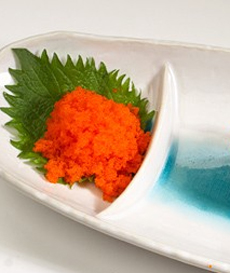 Two types of roe: above, masago sashimi on a shiso leaf. Photo courtesy Catalina Offshore Products. Below: Mentaiko, pollock roe. Photo courtesy San Francisco Food.