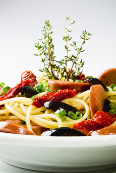 Use brats in recipes: Here, garlic brats with spaghetti, eggplant and sundried tomatoes. Photo © F. Ocha | Fotolia.