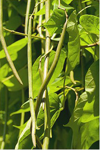 Photo of vanilla pods courtesy of Danish-Schnapps-recipes.com. The leaves in the photo are not the leaves of the vanilla orchid, but of the tree upon which the orchid vine is growing.