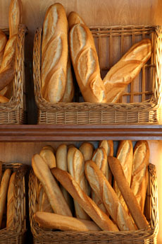 French bread is a term that applies to a variety of different-shaped loaves that have a crusty exterior and a chewy crumb. French bread is typically made from wheat flour, water, yeast, and salt. Some of the shapes include baguette, bâton, boule, ficelle, and flûte. In the photo at right on the top shelf, slender ficelles appear to the left of large batards. On the lower shelf, smaller bâtons can be seen next to a basket filled with baguettes. Here’s a discussion of the difference between French bread and Italian bread.