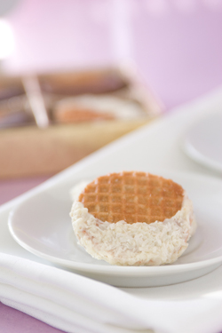 Like coconut? You’ll enjoy the white chocolate Dutch Moon Cookie, rolled in coconut. What may look like a lot of white filling in the photo is the moon shape on the top of a round wafer. |