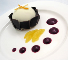 All this takes is assembling! A scoop of ice cream, napolitans of chocolate (buy them or cut them from a scored bar), Knipschildt Chocolate Dulce de Leche Sauce, and some citrus accents: candied grapefruit peel and orange segments.