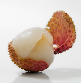 The typical lychee is about one inch in diameter. The outer covering is a pink-red, roughly-textured rind that is inedible but easily peeled with one’s fingers. The flesh inside is white, translucent and sweet, rich in vitamin C, with a texture somewhat similar to that of a grape. Children liken lychees to “eyeballs.”