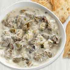 A rich soup made of butter, cream (or half-and-half) and shucked oysters, with celery, onions and shallots, seasoned with salt, pepper and cayenne. There is a thin line between oyster chowder (above) and oyster stew: both are chunky soups made with oysters, vegetables and potatoes, plus milk or cream. Stews generally contain less liquid; thus, more oysters and vegetables and less soup base than chowder. Here’s more about the different types of soups.