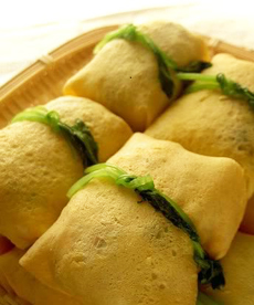Vinegared rice wrapped in a thin egg crêpe. Also called fukasa-sushi. The rice can be seasoned with nori flakes, sesame seeds, or other Japanese ingredients, such as caviar pearls. In addition to the style in the photo, it is also gathered up into a beggar’s purse-type pocket.