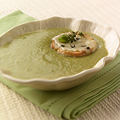 Heavy cream is drizzled to make a design on top of this cream of carrot soup. In this cream of celery soup, a crouton is topped with melted cheese and fresh herbs. Tomato soup gets a garnish of lump crabmeat, fresh basil, shredded Grana Padano cheese and snipped chives.