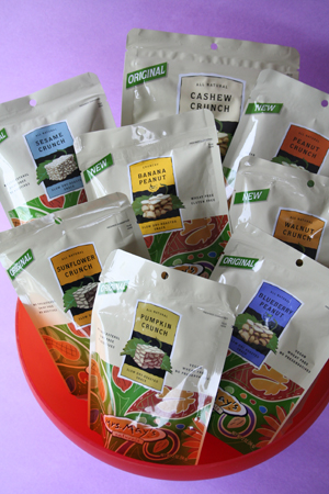 “At Mrs. May’s, we are mostly nuts,” proclaims the company. The company began with Grandma’s nut crunches, and has done a splendid job of developing the line. In terms of favorites: When we are in front of all of the flavors at trade shows, we can’t resist tasting all of them—two or three times. Let’s start with the classic crunches: nuts and sesame seeds.