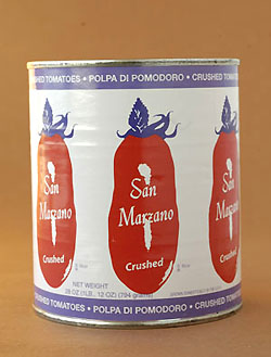 San Marzano tomatoes are sold crushed, diced and whole. In the Simpson (unbranded) product, the tomatoes are canned with salt, calcium chloride to keep the color bright and citric acid as a preservative. The liquid in each can is an exquisite tomato juice—don’t discard it, but enjoy it as a snack while you’re cooking. The cans are 28 ounces (1 pound, 12 ounces).