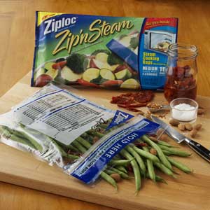 What both Glad and Ziploc show is how easy it is to steam up elaborate recipes in microwave bags. Ziploc offers recipes such as Shanghai Chicken and Zucchini with Spicy Mandarin Ginger Glaze served with Warm Sesame Cabbage Salad with Soy and Scallions (shown in the photo below). Or, steam up desserts like Apple Dried Cherry and Walnut Compote or Poached Pears and Raspberries with Cinnamon Cardamom and Toasted Coconut. You could steam plain string beans—or Green Beans With Sun-dried Tomatoes and Almonds.