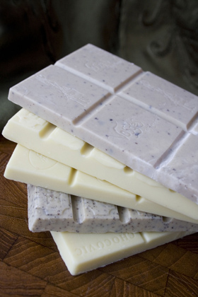 Today, just about every major chocolate maker produces a bar (usually plain, but sometimes flavored), and many a pastry chef spins white chocolate cake, ice cream and mousse from large blocks of white couverture. Its ivory color makes it a lovely contrast against dark chocolate backgrounds of cakes and bonbons. Certain flavors marry better with white chocolate than they do with dark chocolate—lavender, for example—which leads to new flavor combinations and recipes. |