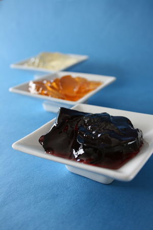 White wine jellies. Clockwise, from top left: Muscat, Chardonnay, Fumé Blanc and Sauvignon Blanc.