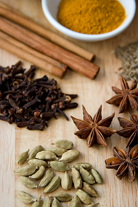 Garam masala, a blend of ground spices common in Northern Indian cuisine, is often added to dishes at the end, to preserve the aroma of the spices. Shown from top: turmeric, fennel seed, star anise, cardamom, cloves and cinnamon sticks. Photo by Georgina Palmer | IST. |