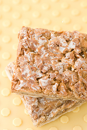 Coconut Lemon Squares: Large shavings of chewy coconut and a lemon filling atop a cookie base. |