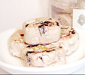 Now on to modern myths. There are people who think they don’t like nougat, simply because their experience has been limited to dime store nougat, rock-hard nougat, or other less-than-the-best nougat. Here we present you with nougat that passes the sultan’s muster—and ours. Nougat that has nothing to do with what you may have experienced on petit fours plates throughout France or elsewhere in your travels. |