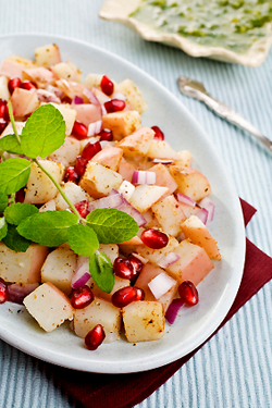 Photo of aloo chat, Indian potato salad, by Linda & Colin McKie | IST. Garnish your own favorite potato salad with bright, tasty arils.