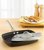 Nopro Enamel Cast Iron Panini Press. BYO pan or griddle and just buy the press. It’s the same approach as the Calphalon system at the left, but uses a pan you already have. Click here for more information or to purchase. |