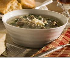 An Italian-American soup of green vegetables (endive and escarole or cabbage, lettuce, kale, and spinach) with meatballs and/or sausage, in a clear chicken broth. The soup sometimes contains pasta as well. It originated in Western Pennsylvania or Ohio, and is not a wedding specialty but it is found on restaurant menus. “Wedding soup” is a mistranslation of minestra maritata, “married soup,” which refers to the “marriage” of the green vegetables to the meat. An earlier, heavier form of minestra maritata, with much more meat, was popular in Toledo, Spain. |