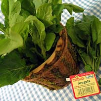 An aromatic salad green that is known in the U.K. as rocket. It has a peppery flavor; the larger leaves can be sharp and bitter, so baby arugula is a better bet for people who don’t like the sharpness. Arugula perks up salads, pasta, pesto and pizza.