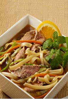 - Divide rice noodles, carrots, cabbage, mushrooms, sliced flank steak, shredded stew meat, cilantro, basil, mint and orange slices among 6 soup bowls.