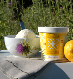• LaLoo’s Goat’s Milk Ice Cream Company (Petaluma, CA). Have you been considering a career change lately? If so, here’s a little inspiration for you. Not very long ago, Laura Howard was a busy entertainment executive in Los Angeles, producing films and Chevre Chiffon Ice Creamcommercials. Now, she makes ice cream from goats’ milk. This was an exceptional journey, spurred by a yoga teacher and a love of dairy products, but Ms. Howard is making it work. The goats whose milk she uses roam over 350 acres of luxurious pasture. And I know they give good milk, because you can’t have a good ice cream without a good dairy base. I have a pint of the Vanilla Snowflake in my freezer as I write this. While it’s lower in fat and calories than many American brands, it certainly does not lack in flavor. Like a snowflake on the tongue, a spoonful is subtle and delicate, present one moment and gone the next. Also like a snowflake, one taste of this ice cream is followed by many others! Other flavors include a Black Mission Fig, a strawberry with balsamic vinegar swirl called “Strawberry Darling”, a Deep Chocolate, and a seasonal Chocolate Cabernet. Another nice plus: goats’ milk is better tolerated by lactose-intolerant individuals than is cows’ milk, so this product will be kinder to those who cannot digest lactose. Available in some retail stores in California, Washington State, and Hawaii, but online orders (4-pint minimum) are also accepted. (Read our full review of LaLoo’s, pronounced LAY-loo.) Shown: Chevre Chiffon Ice Cream.
