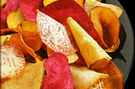 | Beets didn’t work in the Terra Chips assortment, but beet juice lends a glorious color to taro chips. |