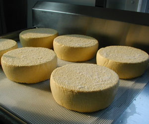 The cheese wheels are salted (see the photo below) and then sent to age in a temperature- and humidity-controlled ripening room, or cave. During its time in the cave, the cheese is washed, brushed and turned to nurture its development. Menuet is aged in the state-of-the-art cellars at Jasper Hill Farm, another maker of fine artisan cheese, for a minimum of five months, until its creamy texture and depth of flavor are at peak. Then it is ready for sale.
