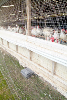 The structure in which the chicken lives. The goal is to provide shelter from the elements, protection from animals, including wild birds, and protection from cats, dogs, hawks, and rodents. Nocturnal predators include fox, opossum, raccoon, and skunk. Many other animals love a tasty chicken.
