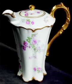 The porcelain chocolate pot at left, by Haviland Schleiger, is 7-1/2 inches high.