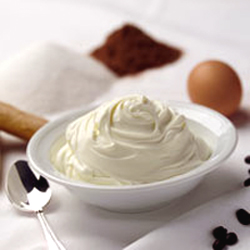 A bowl of mascarpone from the Italian producer Grifolatte. It is an extremely smooth, slightly sweet fresh cheese that is similar to Devon Cream or Clotted Cream. |