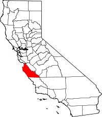 Even those who know Jack well may not know the confusion surrounding the history of Monterey Jack. Supposedly, Spanish missionaries who came to California in the 1700s made a cheese that they called queso de país, or country cheese. After the missionaries had gone, local farmers continued to make this cheese, which evolved into a product similar to the Jack we know today. By the latter half of the 1800s, queso de país seems to have been a well-known and widely accepted local product. One claimant to the origin of Jack was Domingo Pedrazzi, who lived in Carmel Valley, in Monterey County, California (Monterey County is highlighted in the map of California at the right). It is said that, during the manufacturing process, Pedrazzi’s cheese required an application of pressure, something he accomplished with a device called a “housejack.” It’s easy to see how this name could have been shortened to result in the name of the cheese. There are also stories of an enterprising woman named Dona Juana Cota de Boronda, who began selling what would become known as Jack cheese door-to-door after an accident left her husband incapacitated and she became the sole support of her family—15 children as well as her husband and herself. Map courtesy of Wikipedia.