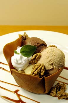 A scoop of cinnamon and a scoop of caramel in a gingerbread cookie dough cup (the recipe: just drape any cookie dough over a Pyrex custard cup, make “hospital corners,” and bake). Drizzle the plate with caramel and add a few toasted or candied walnuts or marrons glacées. Photo by Marcin Bania | IST.
