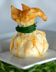 Beggar’s purses get their name because anyone would beg for these unique pockets of caviar. They were created by Chef Barry Wine of The Quilted Giraffe restaurant in New York City—one of the great temples of cuisine in the 1980s. A teaspoon of caviar is added to the center of a small crêpe and topped with a dab of crème fraîche. The edges of the crêpe are pulled up in pleats around the filling and securely tied with a chive or green onion.