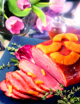Ham with Pink Peppercorn Peach Honey Glaze. |