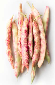 The runner bean (Phaseolus coccineus, Fabaceae) is often called the scarlet runner bean because of its bright red flowers. The beautiful beans can be pink, purple, red and tan, accented with black. They look handsome on a plate or in a jar as kitchen decor.