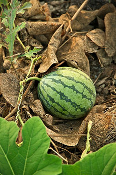 A watermelon growing in a patch. Photo by Fred Hsu | Wikimedia.