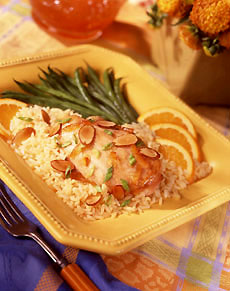 - To serve, spoon the rice onto 4 plates and top each with a half chicken breast. Sprinkle with toasted almonds and green onions. Add green beans. Garnish plate with orange slices.
