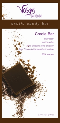 Creole Bar. Journey to New Orleans and a 70% São Tomé chocolate, flavored with coffee and speckled with cacao nibs and chicory root. Coffee and chocolate have been paired together for years because they enhance each other’s flavors to extraordinary heights: Creole makes this deliciously clear. It’s immediately robust with a bold chocolaty strength supporting hearty roasted coffee notes. Coffee dominates the palate and elevates the overall tone to a much bolder level that the chocolate would not be able to achieve by itself. The texture is thick, melting slowly. The nibs add an appealing coarse graininess and crunch. The chocolate itself is heavy on the palate and very full-bodied, delivering a boldness common of São Tomé (an island nation off the west coast of Africa) cacao and the coffee that flavors it.