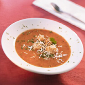 Tomato soup gets a garnish of lump crabmeat, fresh basil, shredded Grana Padano cheese and snipped chives. |